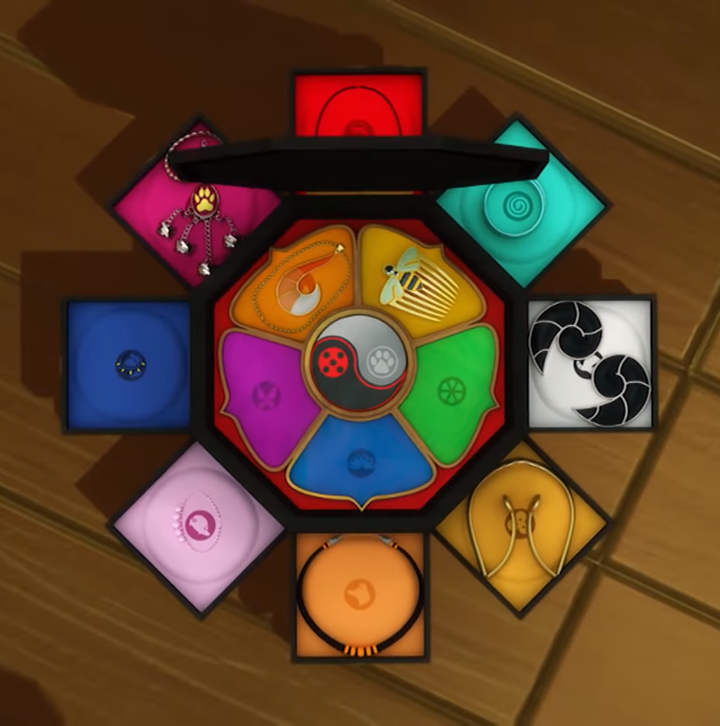 En la capsa hi ha 7 prodigis principals: la marieta, el gat, la guineu, l'abella, el paó, la papallona i la tortuga. La marieta, el gat, la guineu, la papallona i la tortuga ja tenen amo: Marinette Doupan-Chen, Adrien Agrest, Alía Césaire, Gabriel Agrest i el Mestre Fu.